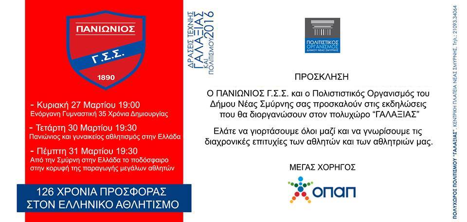 Ο ΠΑΝΙΩΝΙΟΣ Γ.Σ.Σ διοργανώνει σε συνεργασία με τον πολιτιστικό οργανισμό του Δήμου Νέας Σμύρνης στον πολυχωρο "ΓΑΛΑΞΙΑΣ" στην κεντρική πλατεία, εκδηλώσεις για τα 126 χρόνια από την ίδρυση του. Στις 30 Μαρτίου "Πανιώνιος και Γυναικείος Αθλητισμός στην Ελλάδα" με ομιλητή τον Θεόδωρο Μπελίτσο . Η εκδήλωση είναι στις 19.30 και την τηλεοπτική κάλυψη έχει αναλάβει το www.nstv.gr