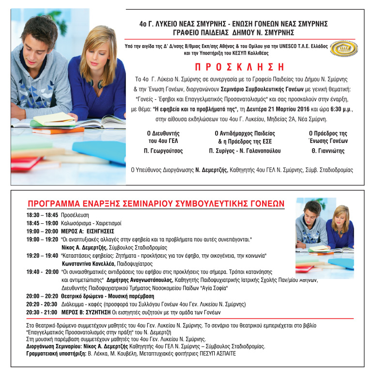 Πρόσκληση-πρόγραμμα της Έναρξης του Σεμιναρίου Συμβουλευτικής Γονέων