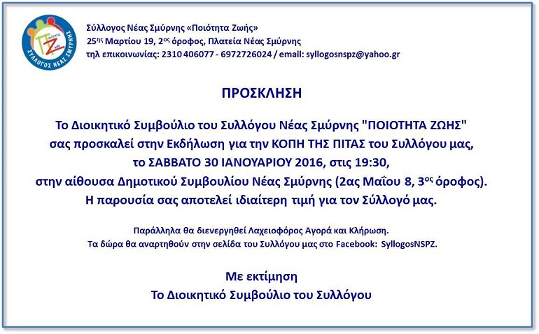 Πρόσκληση στην κοπής της Πρωτοχρονιάτικης Βασιλόπιτας της Ποιότητας Ζωής