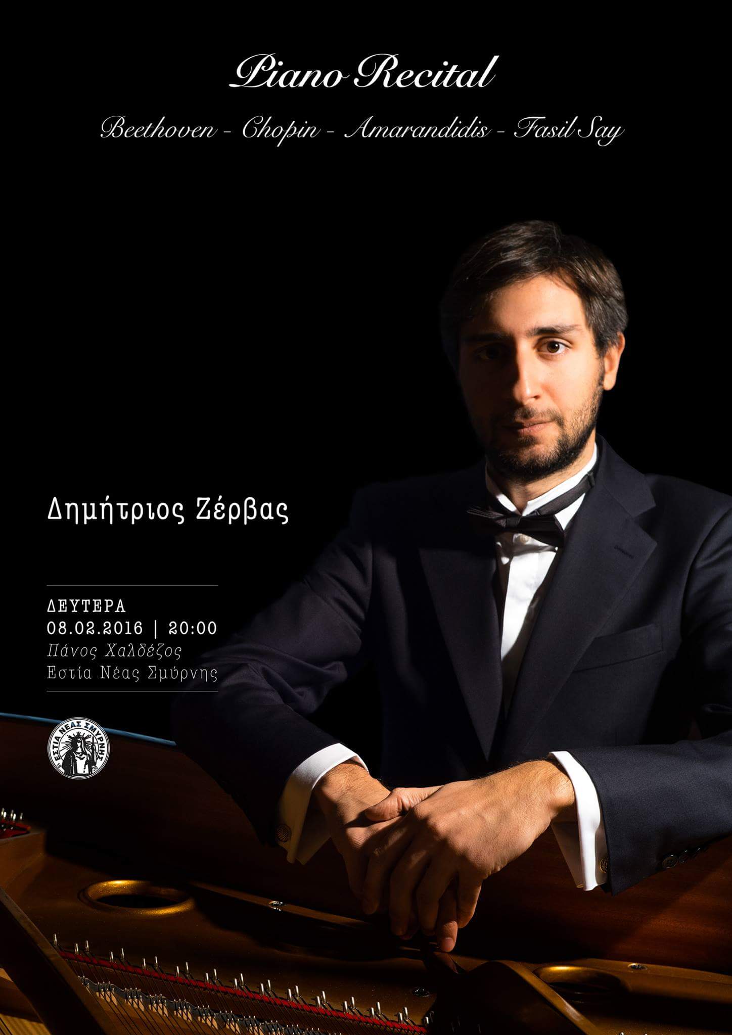 Η Εστία Νέας Σμύρνης σας προσκαλεί στο ρεσιτάλ πιάνου του διπλωματούχου πιανίστα κου. Δημητρίου Ζέρβα, με έργα Beethoven, Chopin, Amarandidis και Fasil Say. Δευτέρα 8 Φεβρουαρίου 2016, ώρα 20:00 στην αίθουσα εκδηλώσεων "Πάνου Χαλδέζου"